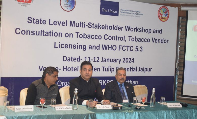 A two-day State-level Multi-stakeholders Workshop and Consultation on Tobacco Control, Tobacco Vendor Licensing and WHO FCTC 5.3 was organised in Jaipur on Thursday. It was organised by SRKPS in collaboration with the Department of Medical and Health, Government of Rajasthan and the International Union Against Tuberculosis & Lung Disease (The Union).